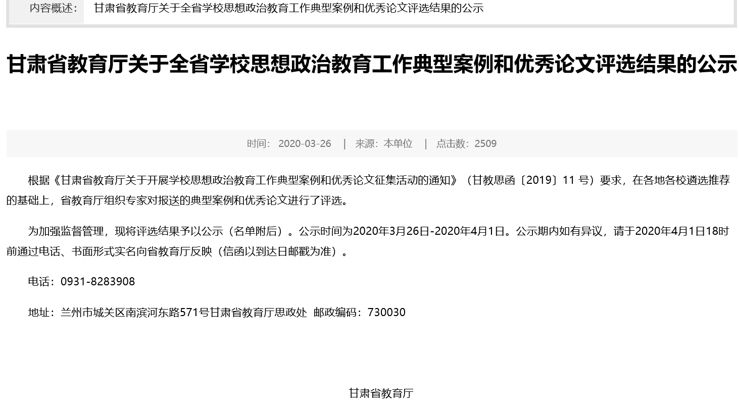 为深入贯彻全国全省教育大会、学校思想政治理论课教师座谈会和《关于深化新时代学校思想政治理论课改革创新的若干意见》精神,总结交流全省各地各校开展学校思想政治教育工作的经验和做法,写好新时代甘肃教育发展“奋进之笔”,甘肃省教育厅组织开展了学校思想政治教育工作典型案例和优秀论文征集活动。