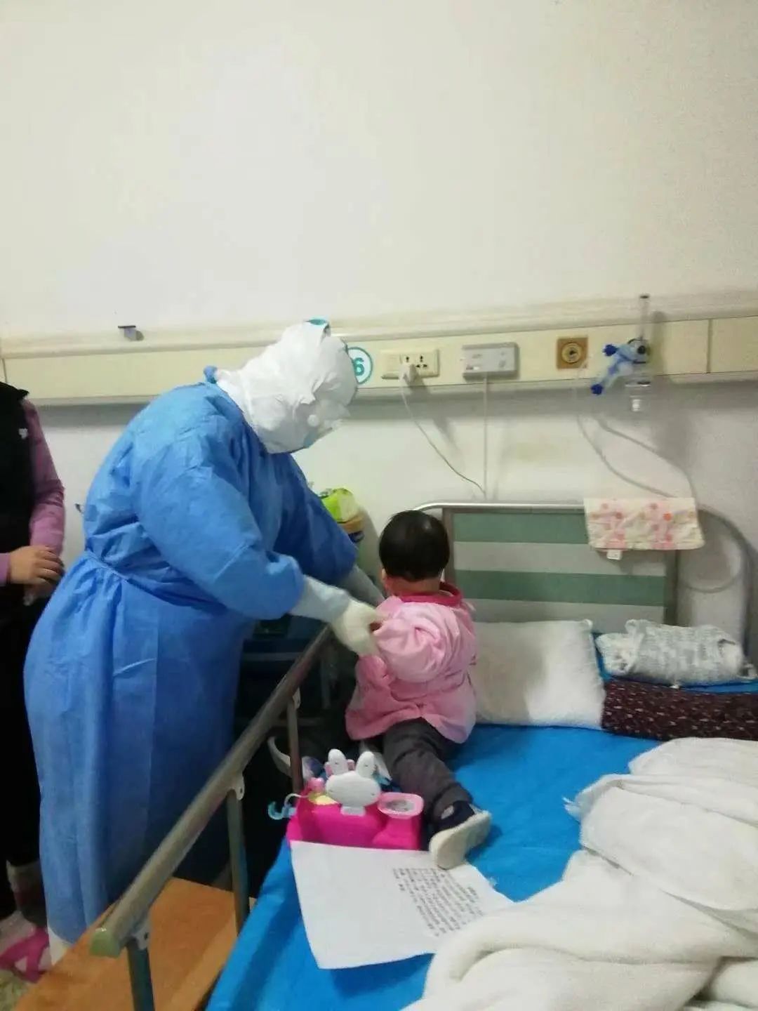 收治的病人中,有一个刚刚满一岁的孩子,母亲及孩子的姥姥都感染了,被一起隔离治疗。刚收治进来的前一两天,全家情绪很不稳定。尤其是孩子很“害怕”被防护服层层包起来、看不见面目的医护人员,加上定期要扎针输液,一见我们她就哭闹不止,让人听着很是揪心……。在这种情况下,姚永娟主动帮着照看这个孩子,给她唱儿歌、逗她笑,有时上班时给她带玩具……。孩子逐渐安静了下来,也开心起来了。当孩子病情稳定出院时,她动情地说,“我感觉那个孩子就是我的孩子,看到她出院,我既高兴又舍不得,等疫情过去了我会过去再看她的。”