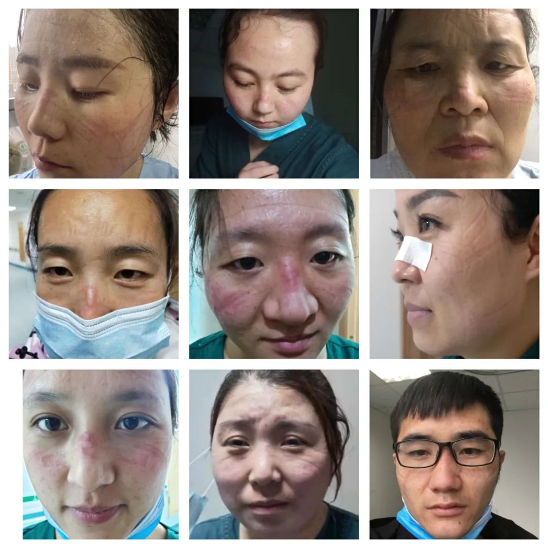 N95魔鬼般的侵蚀,密不透风的防护服,呵满雾气模糊的视线,缺氧憋闷导致的张口呼吸,在这样密不透风的防护装备下平时能达到99%-100%氧饱和度的我们现在只能达90-95%左右,在这样缺氧的状态下大家的背早已湿透,我能清楚的感觉到脸颊的汗水顺着脖子滴下,八小时左右不能吃喝不能上厕所导致大家都处于一种脱水的状态。记得昨天下午一位老师因为缺氧而头晕恶心但还在坚持工作,因为她知道自己休息了剩下的工作压力就会顶到其他战友身上,就在下班的那一刻她终于忍不住吐在了口罩上,满脸的勒痕、脸庞破溃的皮肤、脱下防护服湿透的衣服、带手套泡皱的双手是对我们战斗者最好的见证。