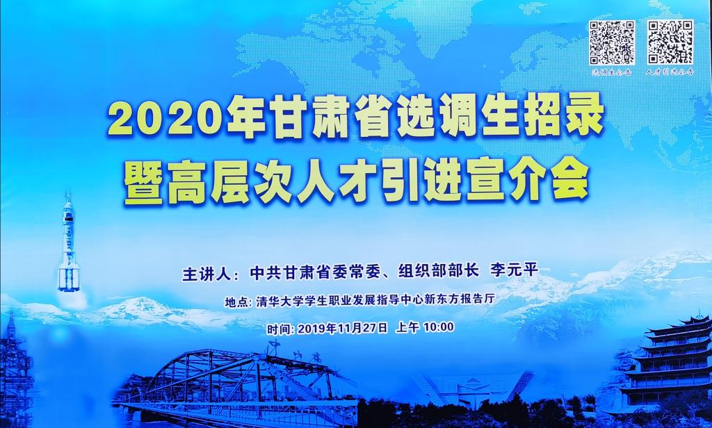 为进一步加大人才引进力度,甘肃省决定面向国内重点高校开展选调生招录和高层次人才引进工作。由省委常委、组织部部长李元平带队,甘肃省人才引进代表团赴京招贤引才。11月27日,在清华大学学生职业发展指导中心举行了宣介及专场招聘会,李元平作了主题宣讲,甘肃医学院参加了招聘活动。