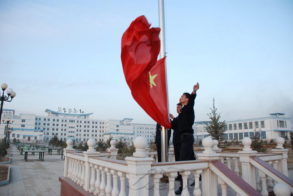 升旗仪式上,全体师生整装肃立。在庄严雄壮的国歌声中,五星红旗冉冉升起。全体师生行注目礼,齐唱国歌,升一份爱国心,添一份热血情。