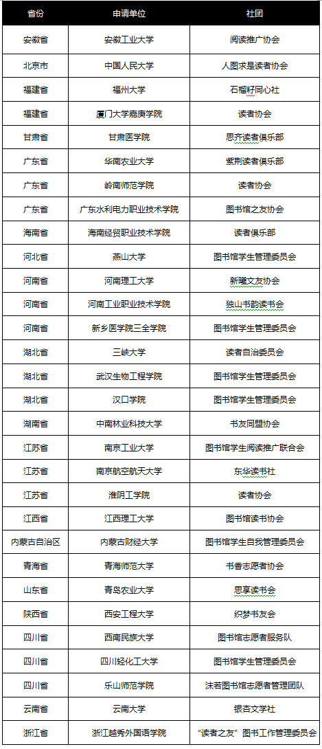 本活动由中国图书馆学会阅读推广委员会主办,武汉大学图书馆、广东外语外贸大学图书馆承办,广东粤图之星科技有限公司提供支持,旨在鼓励以阅读为主要活动内容的学生社团,促进高校学生社团繁荣发展,推进全民阅读推广工作稳步持续开展。活动于2019年6月1日正式启动,征集时间为6月1日至6月30日,最终共征集来自27个省、自治区、直辖市,189所图书馆,215个学生社团提交的申报材料。