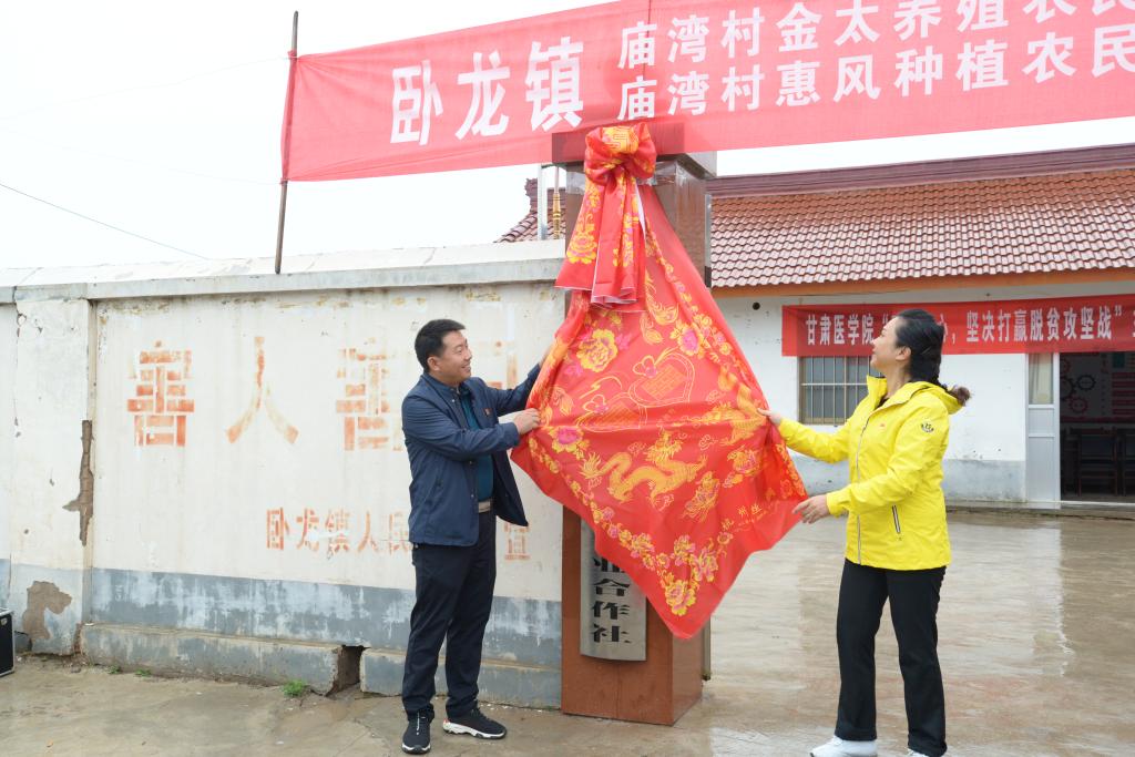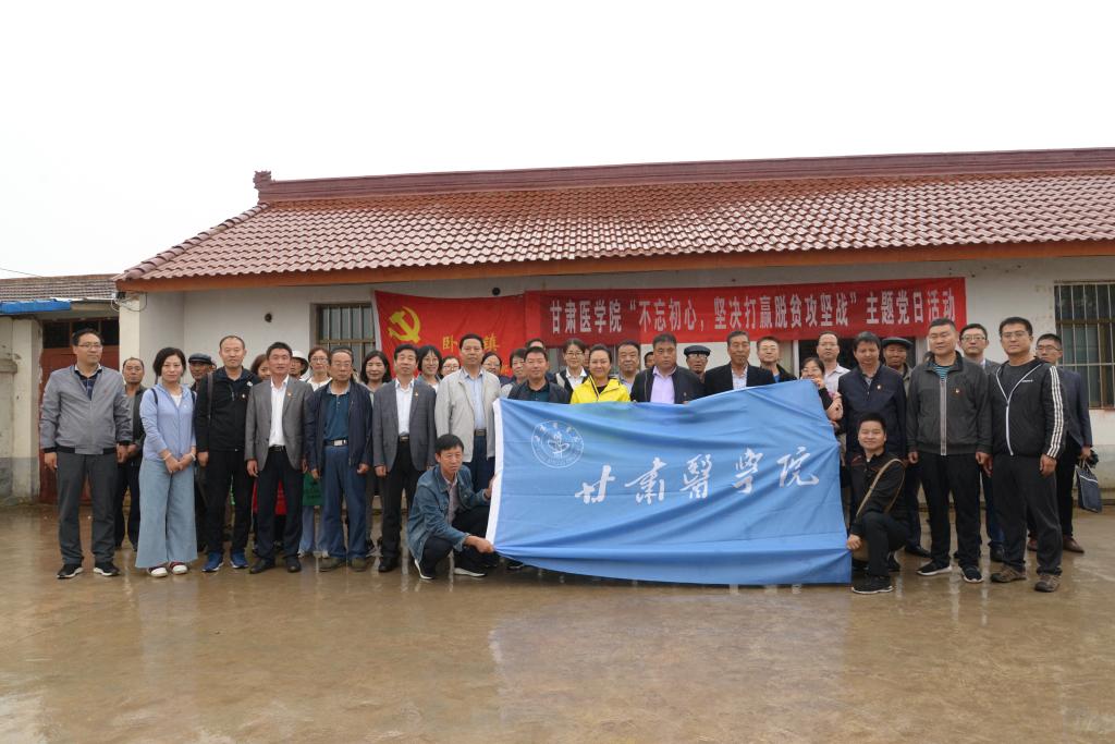 8月22日,在蒙蒙细雨中,甘肃医学院办公室党支部、组织人事党支部全体党员、医疗专 家等30余人赴学院帮扶点庄浪县卧龙镇魏山村、庙湾村开展 “不忘初心、坚决打赢脱贫攻坚战”主题党日活动,甘肃医学院党委书记高淑美以普通党员身份参加了活动。全体党员首先参加了庙湾村金太养殖农民专业合作社、惠风种植农民专业合作社揭牌仪式,集体重温入党誓词。随后参与活动的人员分两队进入庙湾村、魏山村了解村史,听取驻村第一书记讲党课,慰问贫困户,开展健康教育、义诊。