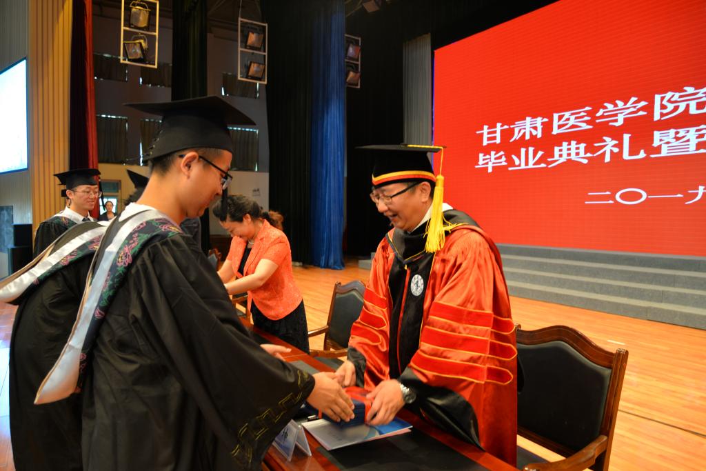 毕业典礼大会上,副院长李诚宣读了《中共甘肃医学院委员会 甘肃医学院关于表彰2019届优秀毕业生的决定》,副院长雷鹏举宣读了《甘肃医学委员会关于印发授予2019届本科毕业生学士学位的决定》。教师代表周凤娟教授、学生代表李佳、魏邦旺分别发言。院长王坤为优秀毕业生颁发奖牌、毕业证书和学位证书。学院领导为2019届毕业生颁发毕业证书。