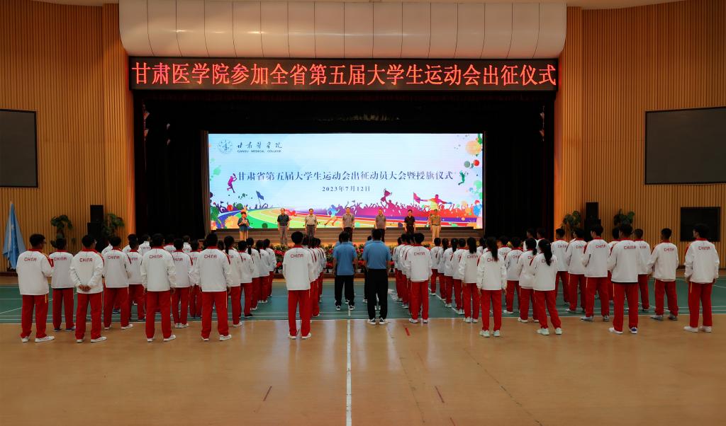 盛夏时节,激情飞扬,甘肃省第五届大运会决战的号角已吹响,大运会参赛工作已进入决战决胜阶段。经过几个月的艰苦训练,甘肃医学院代表团也即将踏上征程。7月12日下午,甘肃医学院在体育馆举行甘肃省第五届大学生运动会出征动员暨授旗仪式,为甘医健儿出征加油助威。学院党委副书记、副院长崔安平出席并讲话,学院办公室、党委宣传统战部、教务处、计财处、国资处负责人以及代表团成员、领队、教练员、运动员参加仪式。公课部负责人主持仪式。