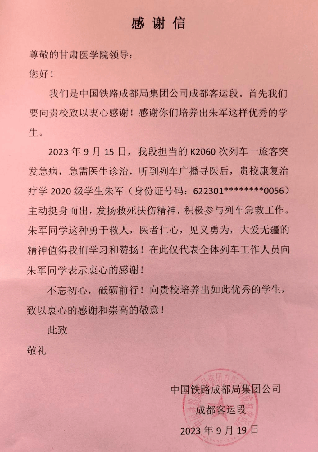 “我们要向贵校致以衷心感谢!感谢你们培养出朱军这样优秀的学生。”9月25日,学校收到来自中国铁路成都局集团公司成都客运段发来的感谢信。信中写到:2023年9 月15日,我段担当的K2060 次列车一旅客突发急病,急需医生诊治,听到列车广播寻医后,贵校康复治疗学 2020 级学生朱军主动挺身而出,发扬救死扶伤精神,积极参与列车急救工作。朱军同学这种勇于救人,医者仁心,见义勇为,大爱无疆的精神值得我们学习和赞扬!在此仅代表全体列车工作人员向朱军同学表示衷心的感谢!