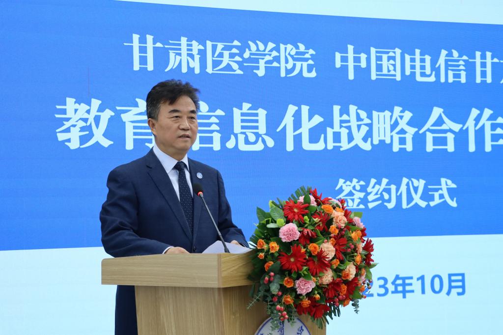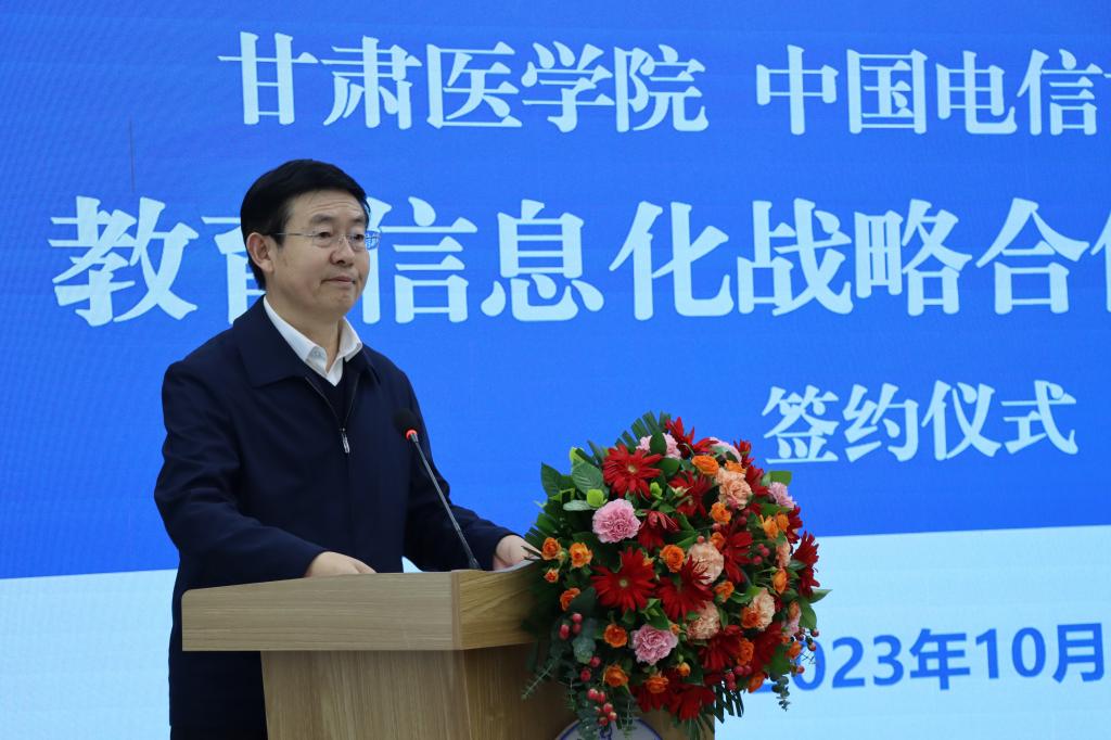 张拴会在致辞中充分肯定了甘肃医学院和中国电信甘肃分公司在助力甘肃经济社会高质量发展方面做出的贡献。他希望,甘肃医学院和中国电信甘肃分公司以战略协议的签署为新的起点,继续发挥推动地方经济社会发展排头兵作用,同心协力,砥砺奋进,在科技创新、产业合作、人才培养、信息化建设等方面积极作为,结出累累硕果,为平凉经济社会高质量发展添砖加瓦。平凉市将一如既往支持甘肃医学院和中国电信甘肃分公司的发展,竭诚为在平高校和企业搭建平台、提供便利、提供支撑。