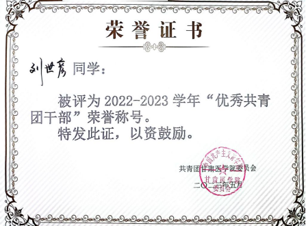 “刘世彦同学学习认真,兴趣广泛。自入校以来所有课程均无挂科,并将绩点保持在3.0左右。以超出合格线近百分的成绩通过英语四级考试。课余生活丰富,不仅参加过合唱表演还取得省二等奖的名次,也曾利用课余时间在校外艺术机构兼职钢琴老师。积极参与科研,大三时在RCCSE核心期刊发表了他人生中第一篇论文。”刘世彦同学的班主任高维仁介绍说,他多次参加各类创新创业比赛,设计的课题在今年举行的大学生创新创业训练计划项目种获得国家级立项,并在第十四届“挑战杯”甘肃省大学生课外学术科技作品竞赛获得一等奖的优异成绩。在较好地完成自身学习任务以外积极参与班级管理,被评为学校优秀共青团干部。