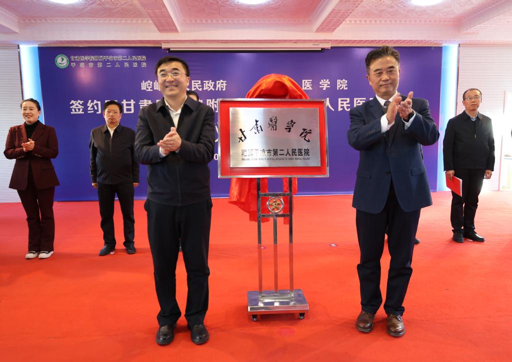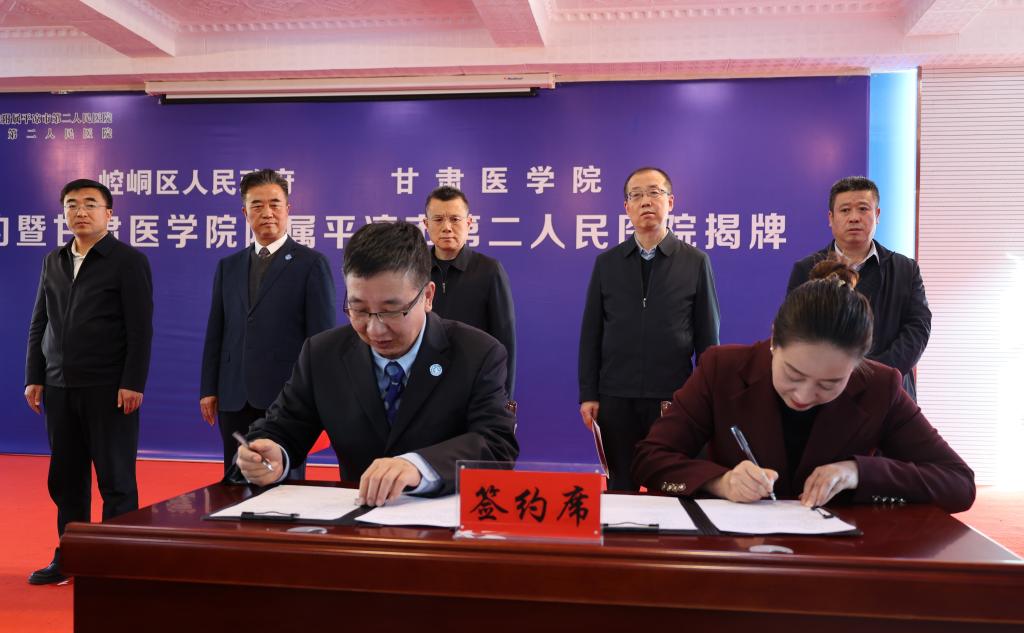 10月26日,平凉市崆峒区政府、甘肃医学院签约暨甘肃医学院附属平凉市第二人民医院揭牌仪式在崆峒区举行。平凉市副市长丁富强,甘肃医学院党委书记、教授汪永锋,甘肃医学院院长、教授王坤,甘肃医学院副院长、附属医院党委书记雷鹏举,平凉市卫健委副主任王亦农,崆峒区委常委、宣传部部长罗彦鹏,崆峒区副区长万红艳出席见证,学校办公室、教务处、实践教学管理处、临床医学系等部门主要负责人以及崆峒区卫健局班子成员、崆峒区各医疗卫生机构主要负责人、平凉市第二人民医院班子成员及相关专家和工作人员共计100余人参加。万红艳主持仪式。