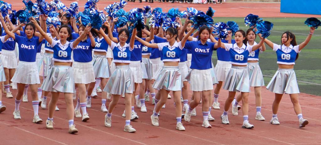 音乐在跳动,青春在飞扬。一个个笑容如花在绽放,一束束花球如碧波在荡漾。绿草如茵,繁花似锦,循梦而行,向阳而生。
