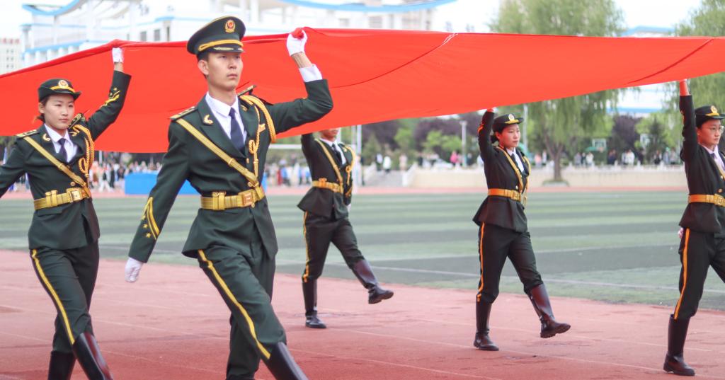 身着飒爽军装的国旗护卫队昂首阔步走向升旗台,在全体人员唱响的国歌声中五星红旗冉冉升起。