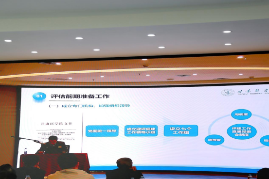 王坤就学校本科教学合格评估迎评促建工作从三个方面进行汇报:一是学院基本情况和评估前期准备工作;二是专家工作流程及重点工作;三是应注意的主要事项。