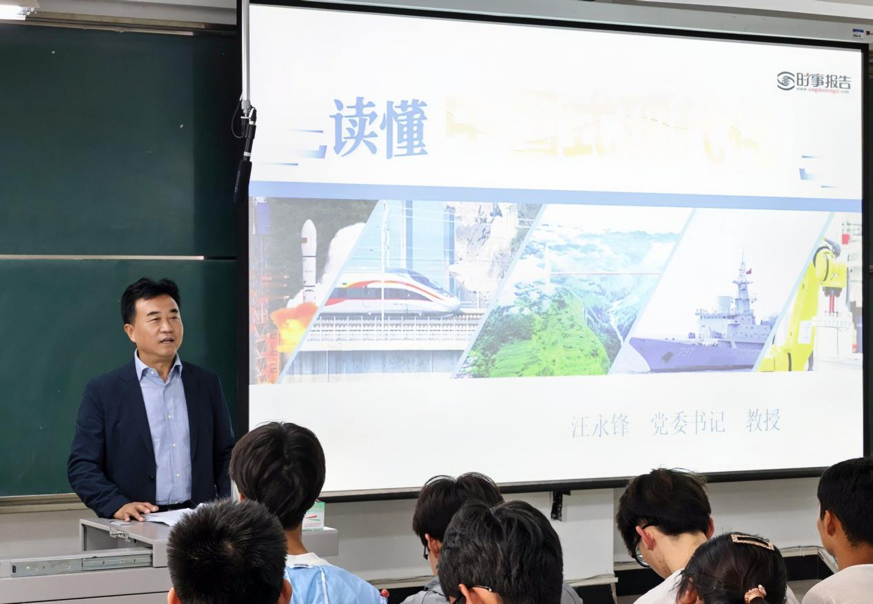 汪永锋从“展现新图景,创造新形态”“拥抱新机遇,无畏新挑战”和“锚定新目标,铸就新伟业”三个方面生动地讲述中国式现代化的丰富内涵、本质要求,以及全面建设社会主义现代化国家的新征程中我们所面临的战略机遇与风险挑战,结合自己的学习和工作经历,运用丰富的资料、详实的数据、耳熟能详的案例,系统阐述中国式现代化,引导学生坚定理想信念,提升道德素养,积极奋发进取,努力成为让党放心爱国奉献担当民族复兴重任的时代新人。