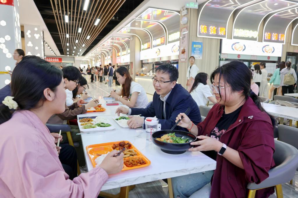 为切实保障师生“舌尖上的安全”,落实学校领导陪餐制度,5月28日中午12点左右,院长王坤走进学生一餐厅,检查餐厅消防、食品安全、饭菜价格、从业人员健康管理等情况,和学生围坐在一起共进午餐,面对面亲切交流,详细询问学生对餐厅饭菜价格、种类口味、营养搭配以及环境卫生等方面的意见建议,深入了解学生的饮食需求和校园生活,勉励同学们坚定理想、明确目标,养成良好的日常生活习惯,努力学习专业知识,不负青春韶华。同学们也积极发言,纷纷表示餐厅的饭菜口味多样、营养丰富、价格适中,环境整洁卫生,校领导陪餐拉近了双方沟通距离,感受到学校对食品安全工作和学生后勤保障工作的重视,倍感关怀与温暖。