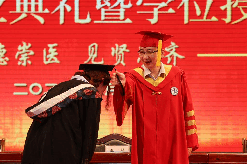 院长、学位评定委员会主任王坤为2024届毕业生代表拨苏正冠、颁发学位证书并合影留念。