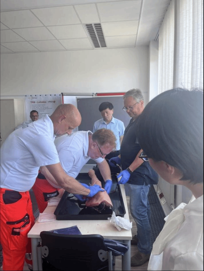 德国巴伐利亚红十字会拜罗伊特区总经理Markus Ruckdeschel及人力资源部主任陈晨等接待了代表团一行。代表团实地观摩巴伐利亚红十字会的培训基地及培训学校、112救援中心、养老院以及空中和水上救援中心等多个重要设施;全方位、多维度地深入了解红十字会进修培训中心的运行模式、设备设施、师资配备、教学计划和学时安排;观摩急救实操课伤口包扎实操讲解;进入教学课堂,体验理论课堂教学,实景模拟教学,小组合作学习等多种教学模式;并向培训中心的教师详细了解学生获取德国职业护理资格认证的相关事宜。双方就护理人才培养、护理急救及老年护理领域的深度合作等方面,进行了实质性的座谈交流,并最终达成合作协议。通过这次友好访问,双方顺利签署合作意向书,建立了紧密的合作伙伴关系。