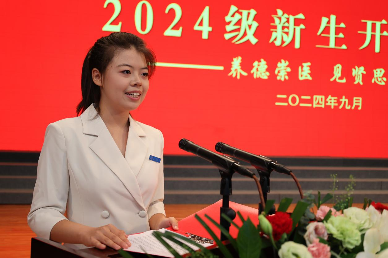 上午10时30分,在雄壮的国歌声中,开学典礼拉开序幕。教师代表、公共卫生学院李静雅教授,新生代表、基础医学院本科临床2413班李东方同学分别发言。