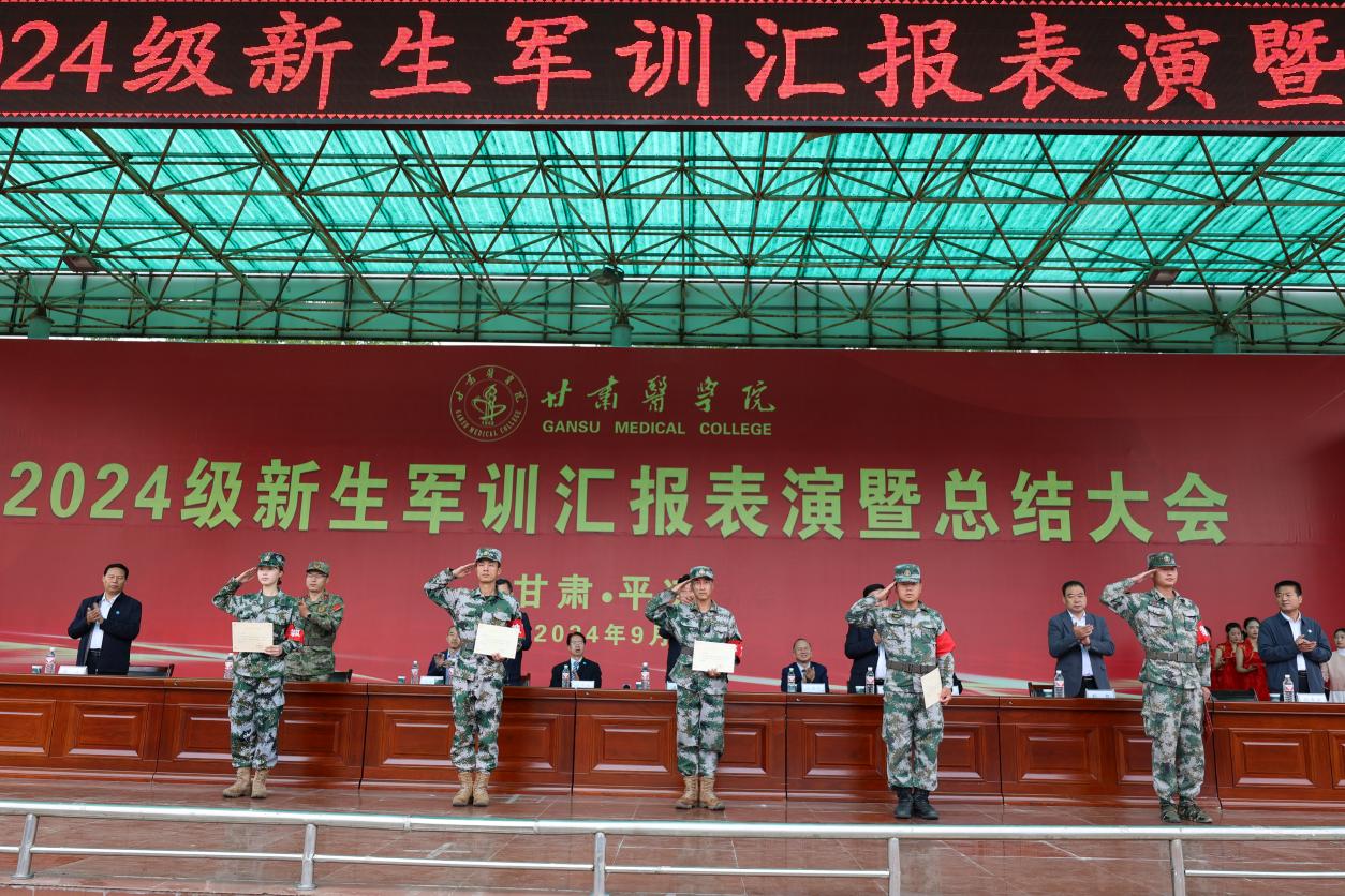 9月14日上午,甘肃医学院2024级新生军训汇报表演暨总结大会在体育场隆重举行。学校党委书记汪永锋出席并讲话,雷鹏举主持,刘凯宣读表彰决定,杨建福、胡希杰、练成以及崆峒区人武部军训总教官李永博出席,各学院党政负责人,2024级班主任、辅导员以及全体新生参加。