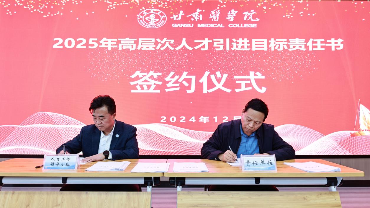 会议审议了《甘肃医学院2025年高层次和急需紧缺人才引进实施方案》《甘肃医学院2025年二级学院(部)引进高层次人才工作任务及考核办法》《甘肃医学院高层次人才考核管理暂行办法》,二级学院(部)负责人代表李红恩、董娜,高层次人才代表朱章芳、刘万涛作交流发言,学校人才工作领导小组与各二级学院(部)签订了高层次人才引进目标责任书。