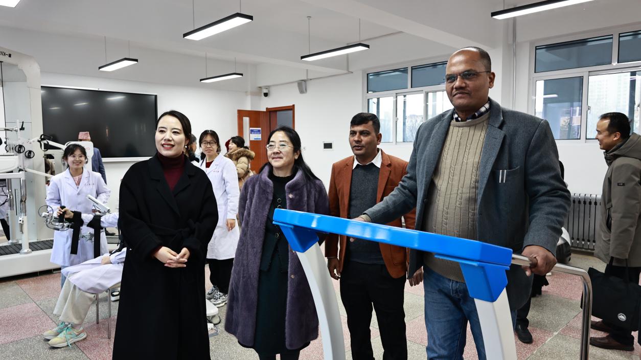 访问期间,特里布万大学代表团一行参观了学校校史馆、图书馆、中药标本馆等教学场所,特别关注了附属医院康复科、中医科、中西医结合科、中药房,在国医馆参加了针灸体验活动。在参观考察康复、针灸实训室之后,同皇甫谧学院教师代表开展了座谈交流。