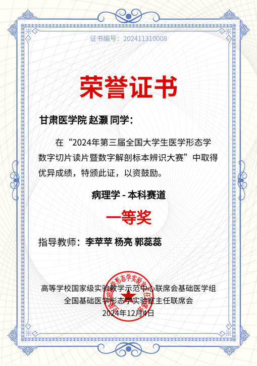此次比赛设置了组胚、病理、寄生虫、微生物和解剖五个项目,全面涵盖了医学形态学的各个重要领域。经过激烈的角逐,我校学生比赛成绩取得新突破,共获奖项15人次,获奖数量居全省第一。其中本科临床2101班赵灏在病理学赛道中荣获一等奖(位列全国第8名),本科儿科2301班毛泽在寄生虫学赛道中荣获一等奖(位列全国第16名),二等奖8人(解剖学4人,病理学2人,微生物学1人,寄生虫学1人),三等奖5人(病理学2人,微生物学1人,寄生虫学1人,解剖学1人),我校获优秀组织奖。
