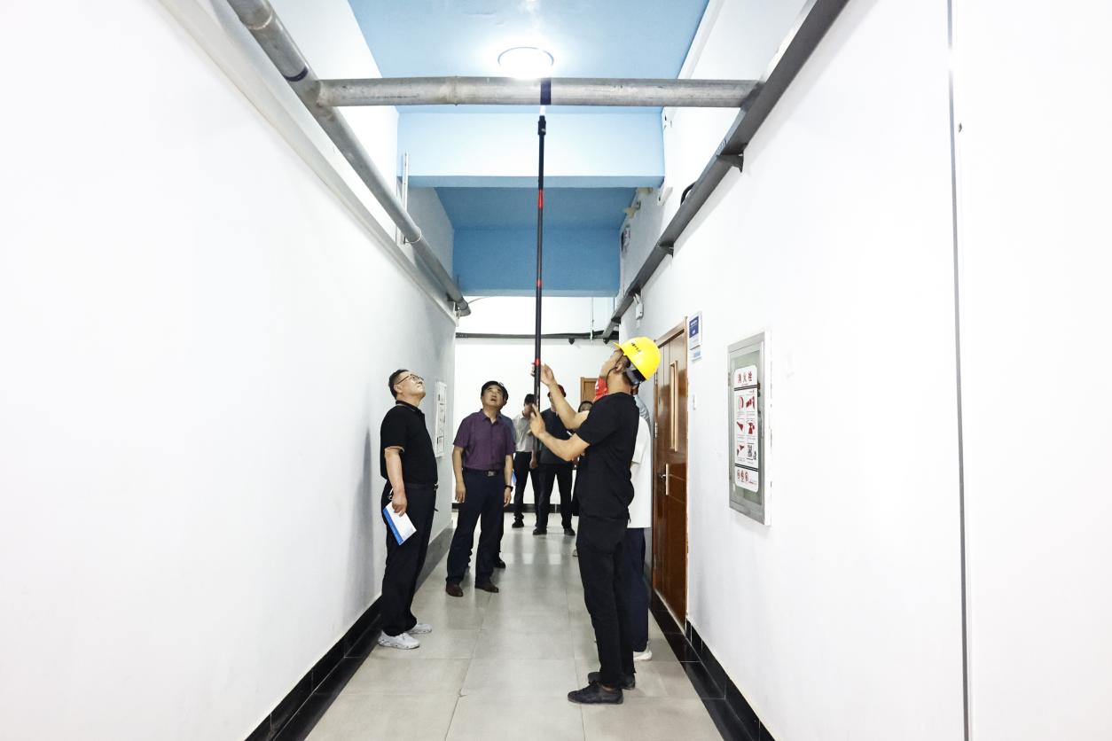 检查组首先来到学校一号实验楼,对校园安全隐患整改设备采购项目中新安装的无线消防自动报警系统装置进行现场功能测试和检查。汪永锋详细询问了设备的运行情况、应急响应机制及日常维护措施,强调要确保消防设施始终处于良好状态,为师生提供坚实的安全保障。