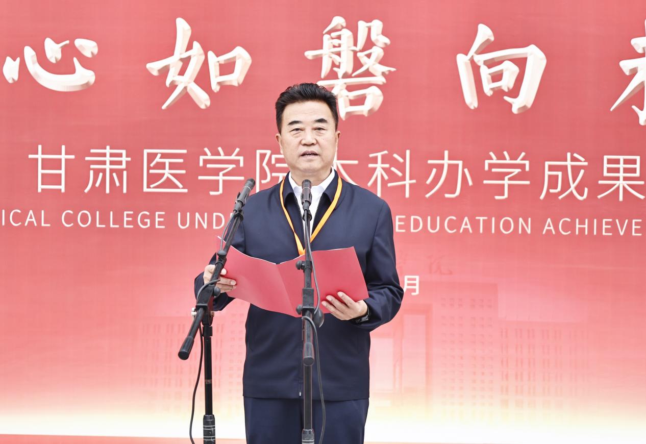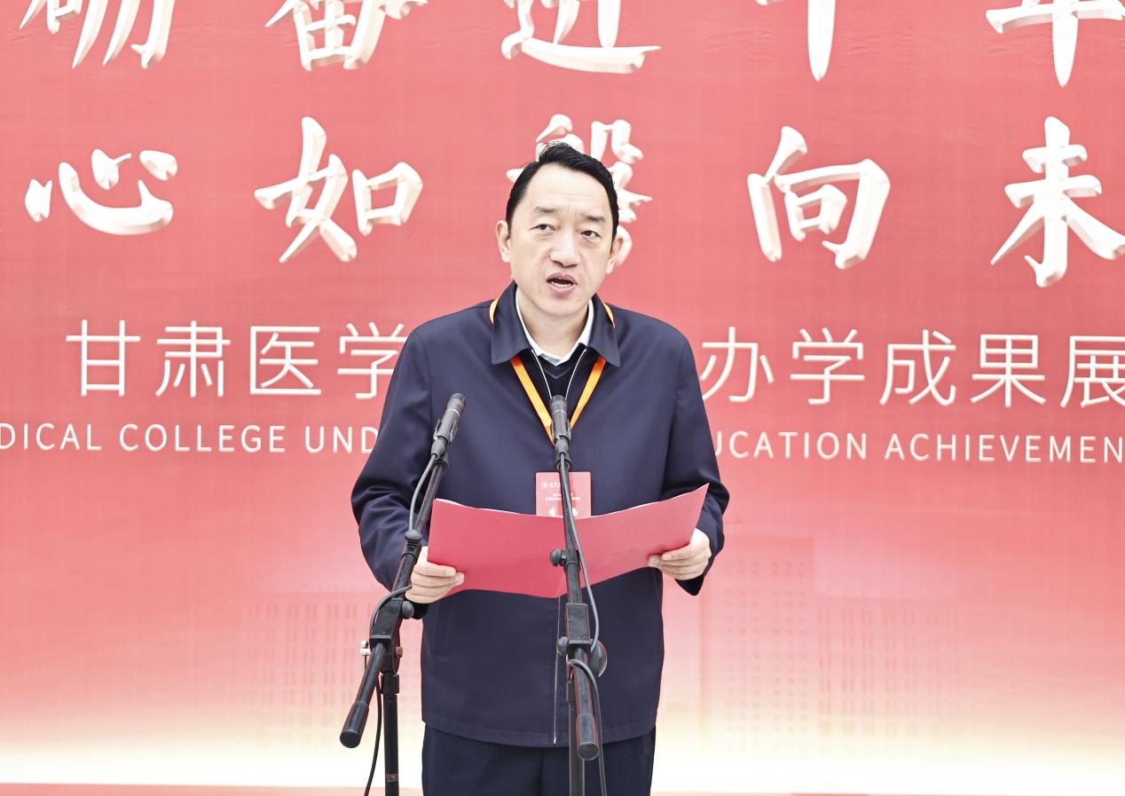 仪式伊始,学校党委书记汪永锋代表学校,向莅临本次展览的兄弟院校、各位来宾、校友表示热烈欢迎。他全面总结了本科办学取得的丰硕成果,充分肯定了全体教职员工为学校教育事业作出的重要贡献。回望过去,本科办学的这十年,是夯基致远、条件改善的十年,是内涵发展、硕果累累的十年,是服务社会、影响提升的十年。学校召开第一届教职工代表大会和第一次党代会,明确医学本科院校的阶段目标和内涵建设的发展之路,确立建设开放的现代化新型应用型高等医学院校的长远目标。建成全国基层西学中能力建设带教基地、国家医师资格考试中医类别实践技能考试基地,国家自然科学基金项目建设实现零的突破。培养全日制医学生2.2万多名,培养学历教育学生1.4万多名,直属附属医院年门诊量由42万人次增加到62万多人次、诊治出院病人由3.26万人次增加到5.14万人次,学校的知名度、美誉度和影响力持续提升。面向未来,汪永锋强调,十年的成就,来之不易,学校将以十年本科办学的成果总结展示为新起点,始终牢记为党育人、为国育才的使命,全面坚持“深化改革、提升内涵、扩大开放、加快发展”的工作方针,认真落实学校“12226”发展思路,不断谱写开放的现代化新型应用型高等医学院校新篇章,努力为推进中国式现代化甘肃实践贡献智慧和力量。
