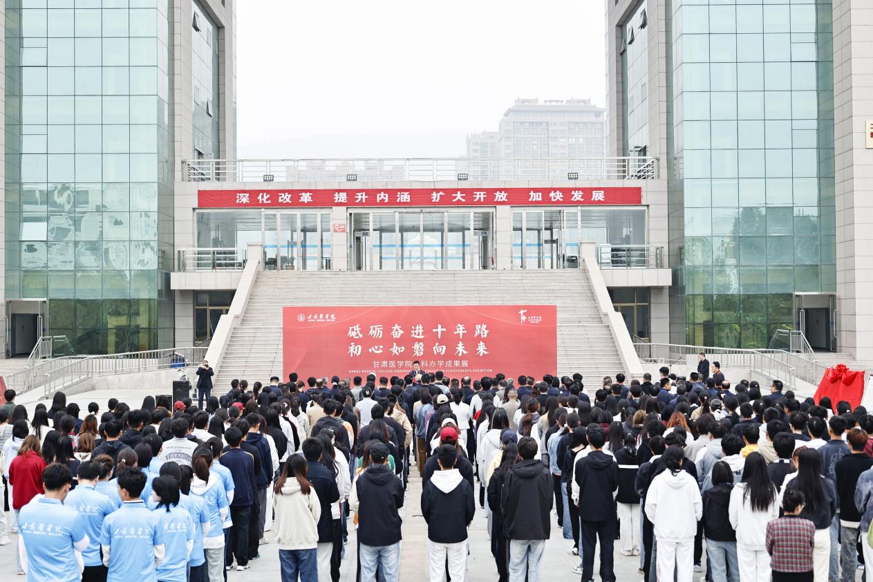 开展仪式结束后,与会领导、嘉宾、校友和师生代表饶有兴致地参观展览。此次展览通过丰富的文字、图片、数据、图表等形式,全方位、多角度地再现了甘肃医学院本科教育从无到有、从弱到强的十年创业史、奋斗史和发展史。生动记录了学校在党的建设、人才培养、科学研究、社会服务、文化传承创新、国际交流合作等方面取得的突出成绩,引发了参观者的强烈共鸣和阵阵赞叹。