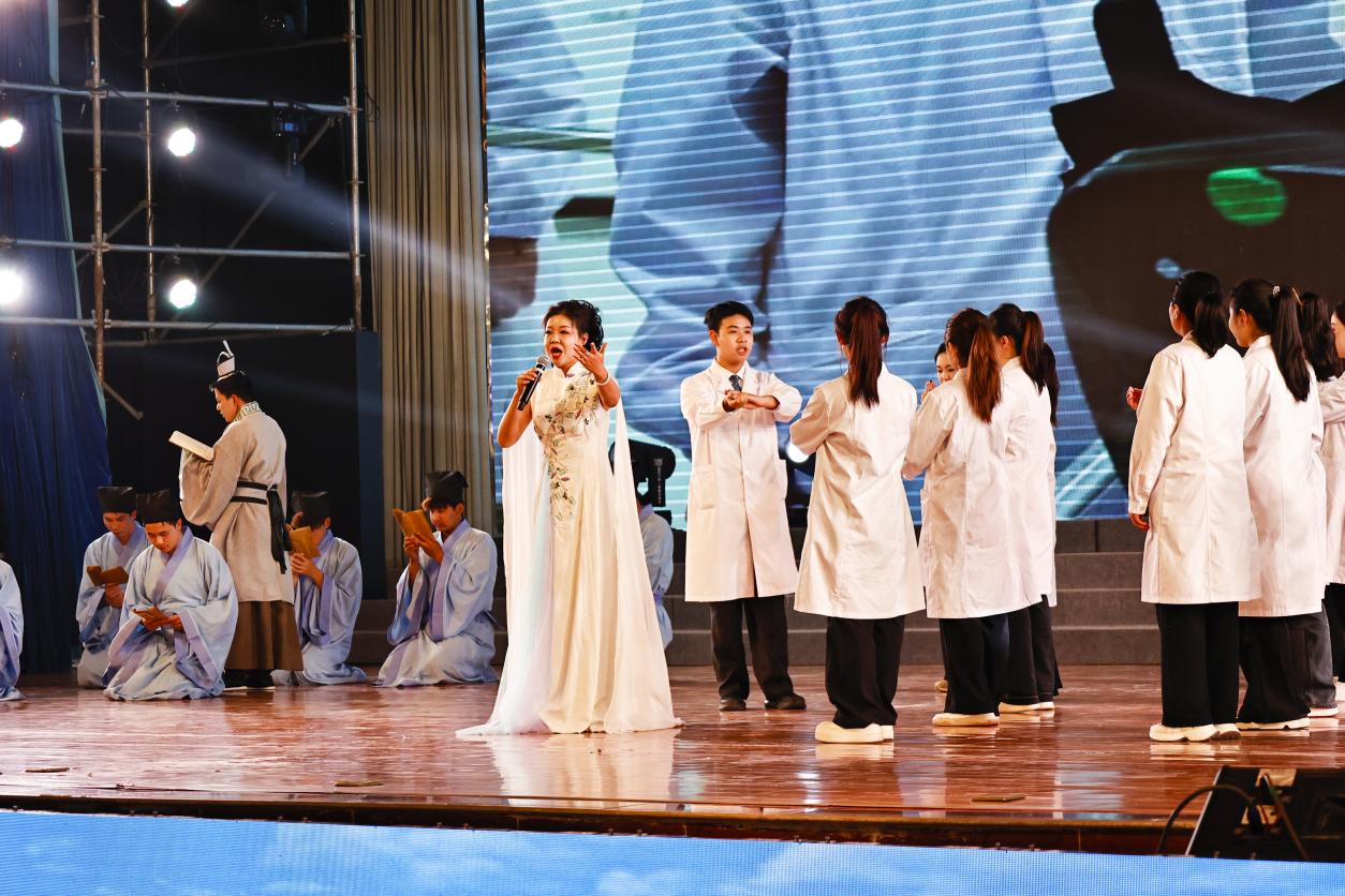 文艺演出在气势恢宏的舞蹈《盛世欢歌》中拉开序幕,展现了学校诞生于新时代背景下的蓬勃朝气。深沉隽永的诗朗诵《医路长歌·十年回响》,以饱含深情的话语娓娓道来学院十年发展的风雨历程与辉煌成就。舞蹈《授护·守护》则通过艺术化的肢体语言,庄重演绎了护理学专业神圣的授帽仪式和护理工作者守护生命、无私奉献的职业精神。民乐合奏《象王行》以恢弘大气的旋律,彰显了学校坚定前行的气魄。情景剧《青春的选择》生动再现了甘医学子毕业后毅然选择扎根基层、服务人民的坚定决心,体现了学校人才培养的鲜明导向。活力四射的歌曲串烧《正青春》,唱出了青年学子的蓬勃朝气与昂扬斗志。独唱《杏林银针》以悠扬的歌声,艺术化的展现了皇甫谧银针济世的仁心仁术,赞颂了医者的大爱情怀。舞蹈《绽放》以优美的舞姿寓意学校事业与学子梦想的绚丽绽放。情景合唱《圆梦时代》将现场气氛推向高潮,表达了师生身处伟大时代、共筑中国梦的豪情。最后,晚会在激昂奋进的歌伴舞《我们的中国梦》中圆满落下帷幕,歌声与舞蹈交织出甘医人迈向新征程的坚定信念与无限希望。