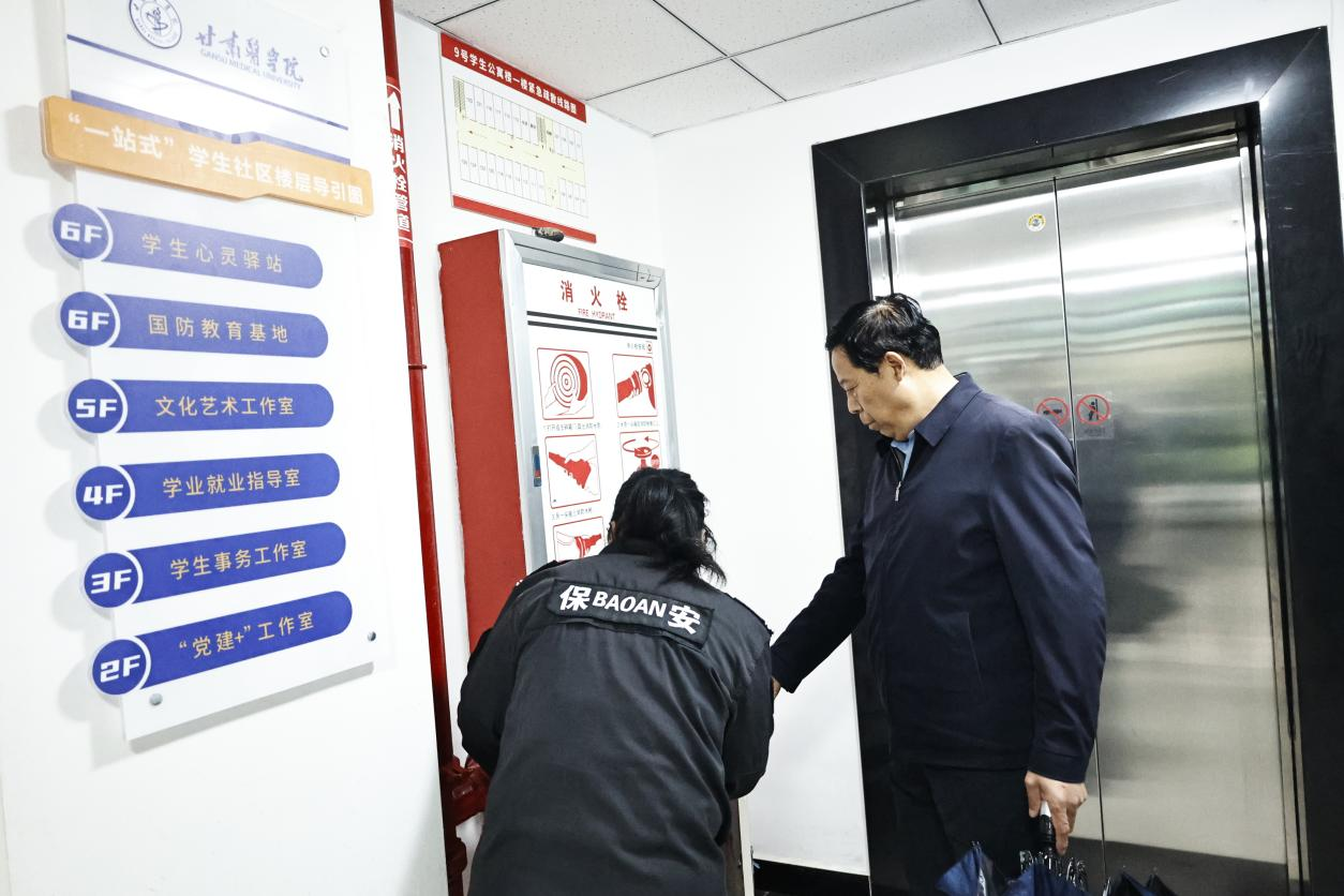 检查组先后前往学生宿舍和图书馆,围绕宿舍安保监控运行、消防安全管理、校舍设施安全、用电规范落实及校园人防、物防、技防体系建设等重点内容开展全面检查,仔细询问隐患排查进度、应急预案完善情况,并现场查看消防设施维护保养实效。