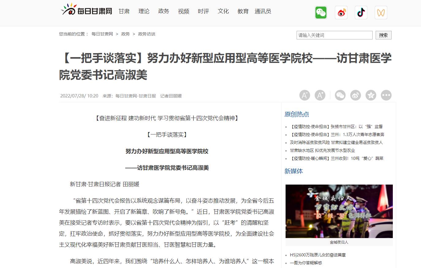 “省第十四次党代会报告以系统观念谋篇布局,以奋斗姿态推动发展,为全省今后五年发展描绘了新蓝图、开启了新篇章、吹响了新号角。”近日,甘肃医学院党委书记高淑美在接受记者专访时表示,要以省第十四次党代会精神为指引,以“赶考”的清醒和坚定,扛牢政治使命,抓好贯彻落实,努力办好新型应用型高等医学院校,为全面建设社会主义现代化幸福美好新甘肃贡献甘医担当、甘医智慧和甘医力量。