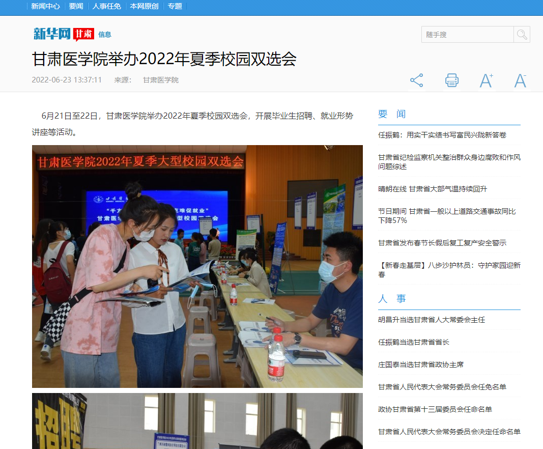 6月21日至22日,甘肃医学院举办2022年夏季校园双选会,开展毕业生招聘、就业形势讲座等活动。