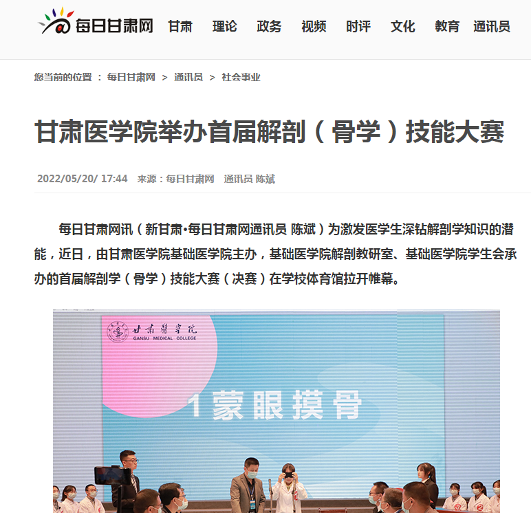 每日甘肃网讯(新甘肃·每日甘肃网通讯员 陈斌)为激发医学生深钻解剖学知识的潜能,近日,由甘肃医学院基础医学院主办,基础医学院解剖教研室、基础医学院学生会承办的首届解剖学(骨学)技能大赛(决赛)在学校体育馆拉开帷幕。