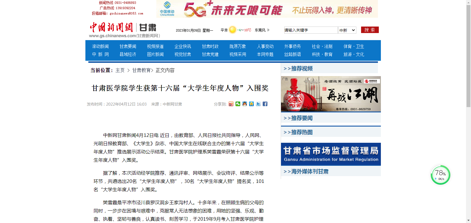 中新网甘肃新闻4月12日电 近日,由教育部、人民日报社共同指导,人民网、光明日报教育部、《大学生》杂志、中国大学生在线联合主办的第十六届“大学生年度人物”推选展示活动公示结束。甘肃医学院护理系樊雪霞荣获第十六届“大学生年度人物”入围奖。