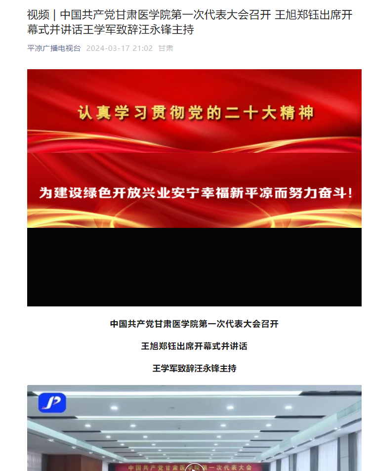 3月16日,中国共产党甘肃医学院第一次代表大会召开,平凉市委书记王旭出席并讲话。省委教育工委专职副书记、省教育厅党组成员郑钰讲话,甘肃中医药大学党委书记王学军致辞,省纪委第八监督检查室副主任申剑峰,省委组织部干部三处一级调研员黄剑锋,市委常委、组织部部长王之臣及天水师范学院、陇东学院、兰州财经大学、甘肃政法大学、兰州城市学院、兰州文理学院等学校负责同志出席大会。