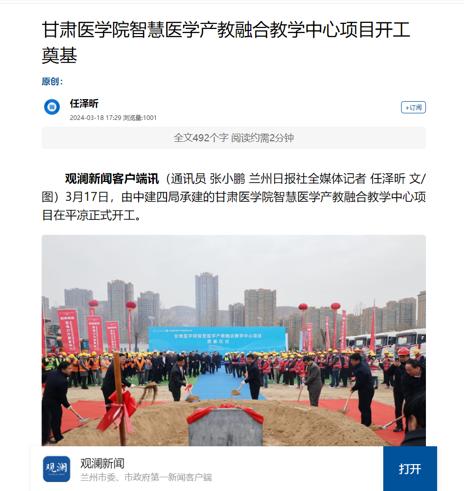 观澜新闻客户端讯(通讯员 张小鹏 兰州日报社全媒体记者 任泽昕 文/图)3月17日,由中建四局承建的甘肃医学院智慧医学产教融合教学中心项目在平凉正式开工。