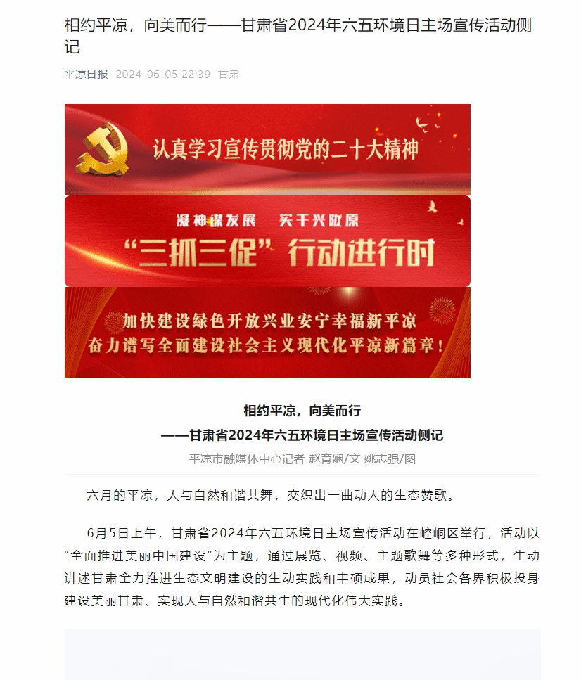 6月5日,由省生态环境厅、省委宣传部、平凉市人民政府主办的甘肃省2024年六五环境日主场宣传活动在我市崆峒区举行。