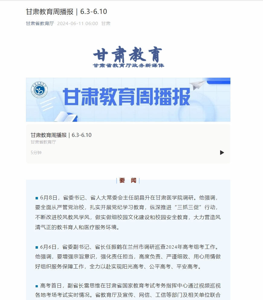 甘肃教育周播报|6.3-6.10,甘肃省教育厅