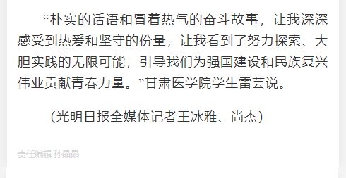 “朴实的话语和冒着热气的奋斗故事,让我深深感受到热爱和坚守的份量,让我看到了努力探索、大胆实践的无限可能,引导我们为强国建设和民族复兴伟业贡献青春力量。”甘肃医学院学生雷芸说。