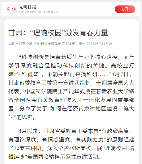 “科技创新是培育新质生产力的核心路径,而产学研深度融合是推动科技创新的关键。高校应打破‘学科孤岛’,不能关起门来搞科研……”4月7日,甘肃省委教育工委第一宣讲团组长,十四届全国人大代表、中国科学院院士严纯华教授在甘肃农业大学结合全国两会有关教育科技人才一体化发展的重要部署,分享了关于“如何在经济待发达地区建设一流大学”的思考。