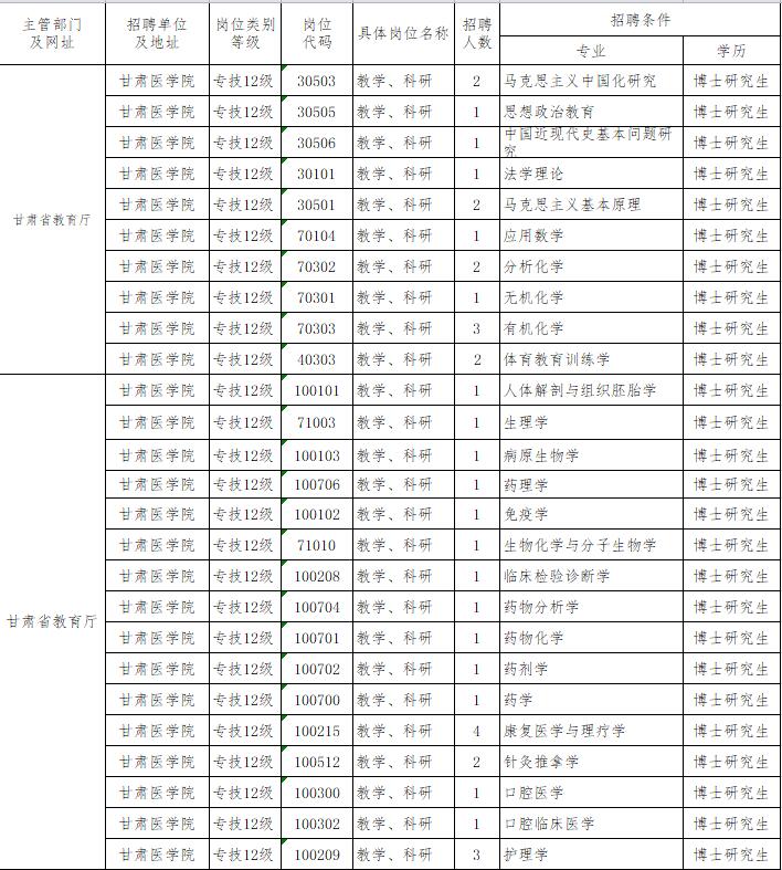 根据《甘肃省事业单位公开招聘人员暂行办法》(甘办发〔2011〕22号)文件精神与相关规定,结合实际,现将甘肃医学院长期公开考核招聘相关专业紧缺专业技术人员有关事宜公布如下: