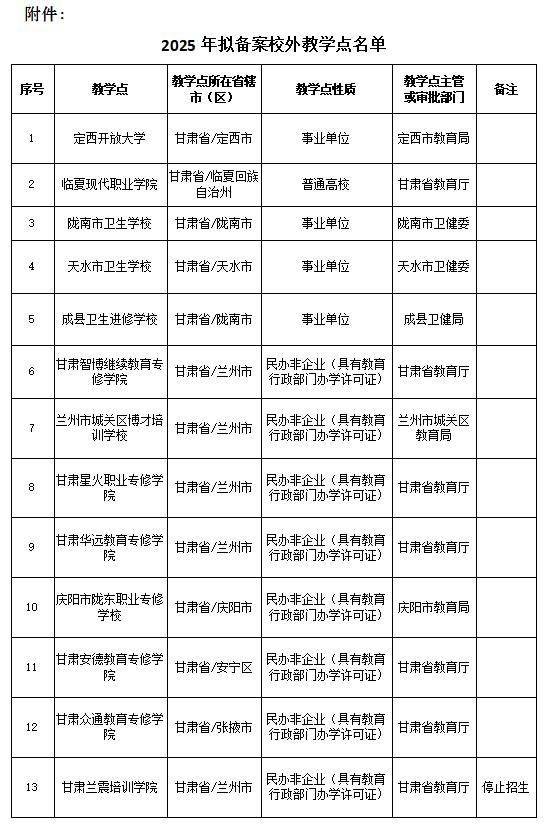 根据《甘肃省高等学历继续教育校外教学点设置与管理办法(试行)》(甘教职成〔2024〕2号)文件精神,我校对照校外教学点设置的基本条件和要求,对现有校外教学点进行了全面评估,结合学校实际情况,2025年拟备案12个校外教学点(见附件),现予以公示。如有异议,请在公示期内以书面形式向继续教育学院反映。