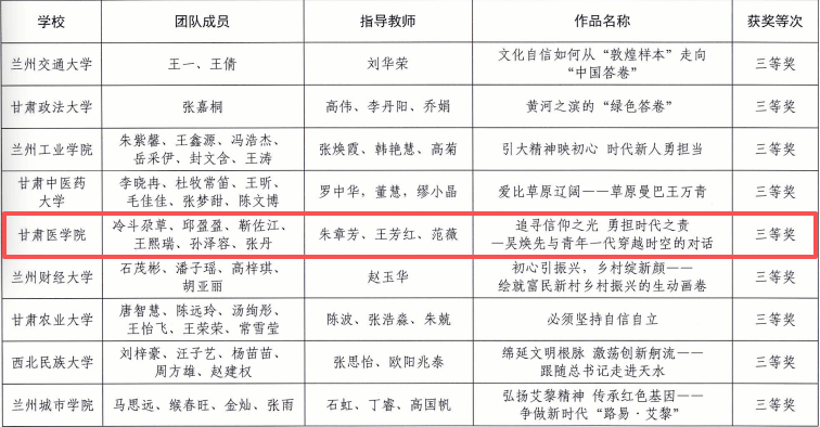 近日,中共甘肃省委教育工作委员会、中共甘肃省委宣传部公布了第五届全省高校大学生讲思政课公开课展示活动获奖结果,由我院教师朱章芳、王芳红、范薇精心指导,冷斗尕草、邱盈盈等6名学生组成的团队,凭借作品《追寻信仰之光 勇担时代之责——吴焕先与青年一代穿越时空的对话》荣获普通高校组三等奖。