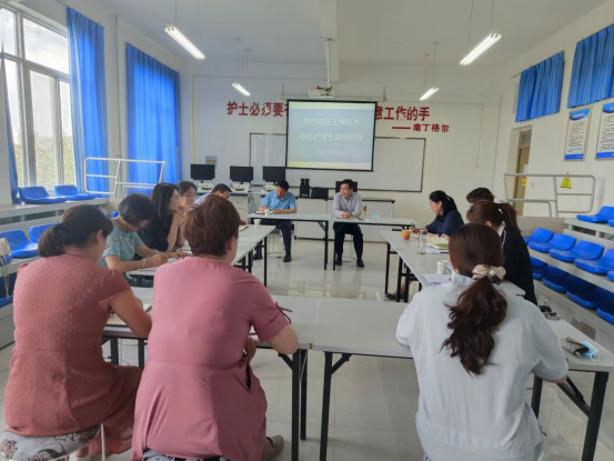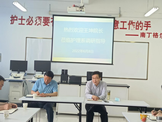 2022年6月8日,王坤院长、办公室主任练成莅临护理系,就教学工作和学生管理工作开展调研指导,并与护理系朱天荣书记、孔玉涛主任、教务科副科长段朝艳、学生科副科长周薇及各教研室主任座谈。座谈会上,孔玉涛主任详细汇报了护理系的教学过程管理、教师专业能力提升、学生专业能力提高、课程建设等情况,系党总支书记朱天荣围绕我系如何实现学生工作精细化、科学化、人性化管理介绍了相关做法。