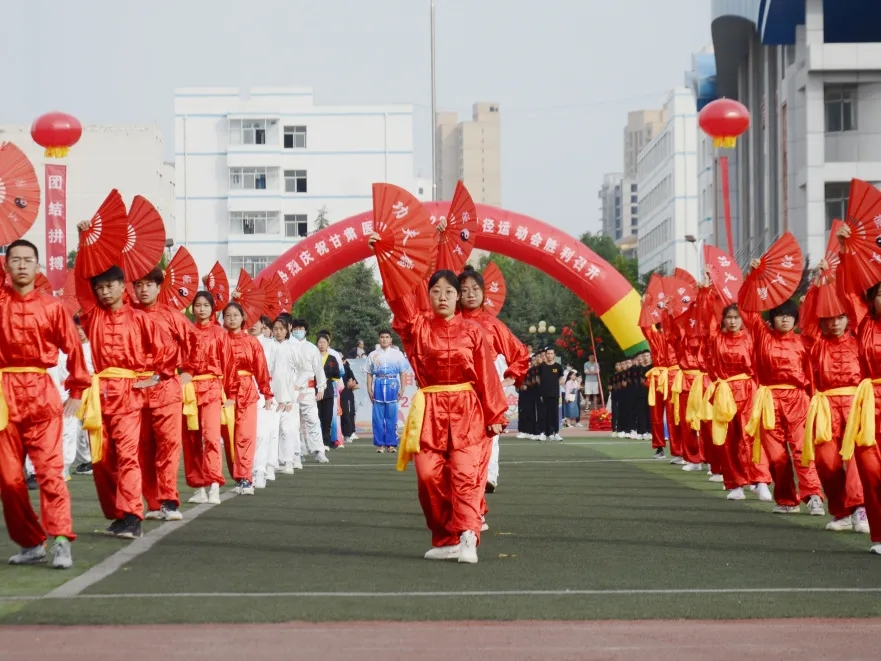 运动场上,红色旗帜在学子们的挥舞下随风飘扬,参赛学生更是精神抖擞,意气风发。 我系的第二个节目是太极扇表演,参演人员刚柔并济,活灵活现地体现出了青春少年的风貌;接下来是武术队表演,他们双手抱拳,紧贴腰间,动作铿锵有力,散发着甘医学子的朝气蓬勃,在朝阳的抚摸下容光焕发;临床医学系的最后一个节目是《少年中国说》,少年强,则国强,在嘹亮的声音中体现出他们的气宇轩昂,斗志昂扬。