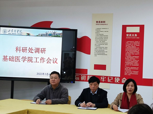 2022年3月4日上午9:00,科研处处长赵玉敏一行4人深入基础医学院调研工作,赵处长在认真听取基础医学院(公课部)党总支书记周凤娟的基本情况汇报和基础医学院副院长杨建设的科研工作思路之后,从学校发展、平台建设、个人发展、教学发展诸方面阐述了老师为什么要做科研,从科研诚信、项目申报等方面点拨了老师如何做科研。与会老师就科研工作中的困惑、问题与体会做了交流发言。会后部分老师预约时间就如何做好下一步的科研工作通过“基金门诊”咨询了赵处长。