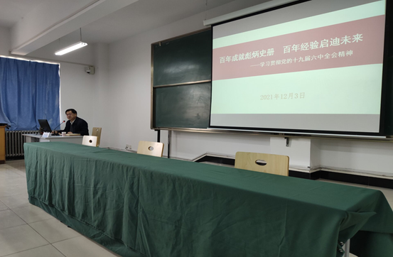 首先杨书记带领师生回顾了中国共产党第十九届六中全会召开的历史背景、基本情况和重要意义。接着重点围绕《中共中央关于党的百年奋斗重大成就和历史经验的决议》,系统回顾了建党百年来取得的新民主主义革命、社会主义革命和建设、改革开放和现代化建设、新时代中国特色社会主义伟大成就,分析了建党百年的五大历史意义和十大历史经验。最后强调:要在深入贯彻学习《决议》精神的过程中,着重理解三个“需要”,两个“确立”,四个“必须”,五大“历史意义”和十个“坚持”,牢记一个“根本问题”,明确一次“十分重要的代表大会”和响应一个“号召”。