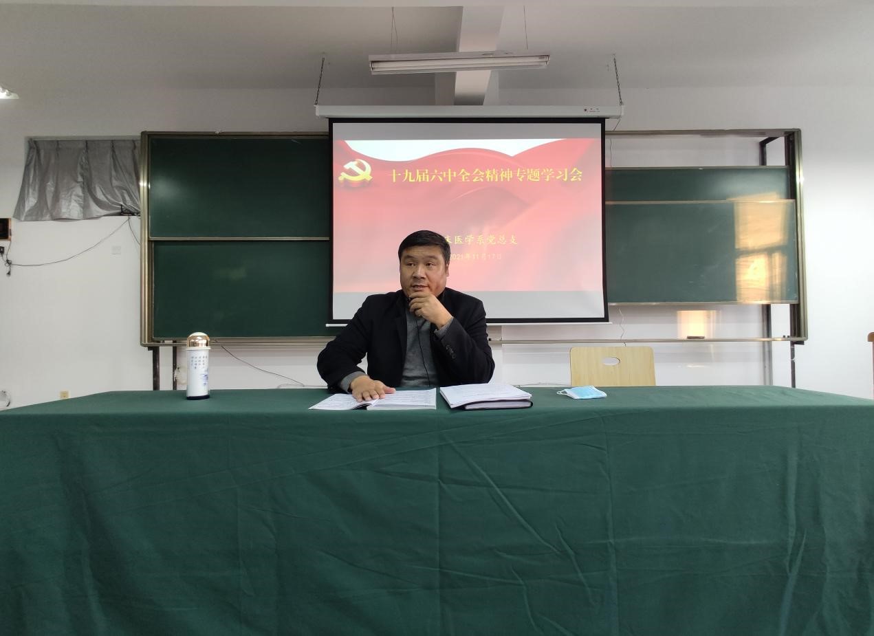 2021年11月18日下午,临床医学系党总支在1号教学楼第7大教室召开十九届六中全会精神专题学习会议,会议由临床医学系党总支副书记李宝成同志主持,教工、学生党支部部分党员、预备党员和入党积极分子参加。