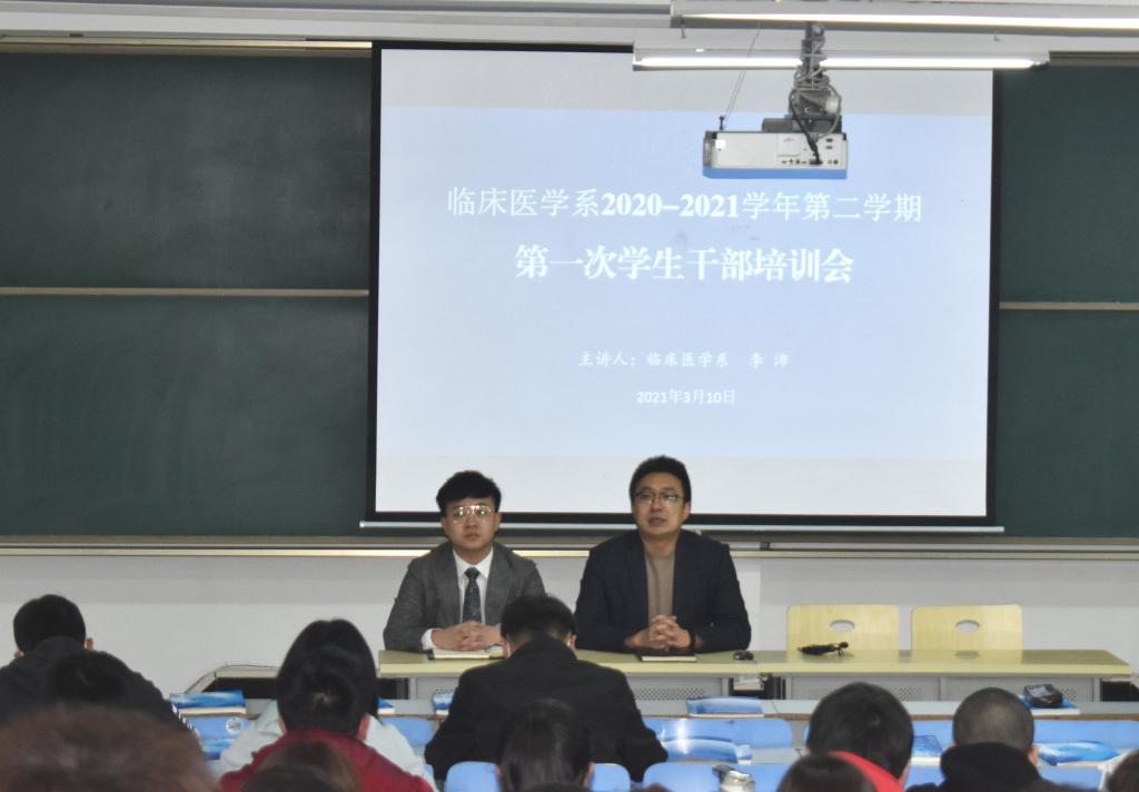 为加强临床医学系学生干部与同学之间的交流沟通,提高学生干部的综合素质和自主管理能力,3月10日中午,临床医学系2020—2021学年第二学期第一次学生干部培训会在一号教学楼第九大教室召开。此次会议由临床医学系学生科副科长、团总支书记李沛主讲、团总支副书记李轶凡出席,全体在校生班长、团支书参加了此次会议。