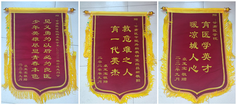 2020年9月18日,甘肃医学院临床医学系临床本科1705班的岳成龙同学在离校外出乘坐出租车前往市区时,及时对一名急性腹痛出租车司机进行了救助并全程陪同入院治疗,进而避免了一场交通事故的发生。受助司机师傅及其家属为表达感谢,为学校和岳成龙同学送来了锦旗。